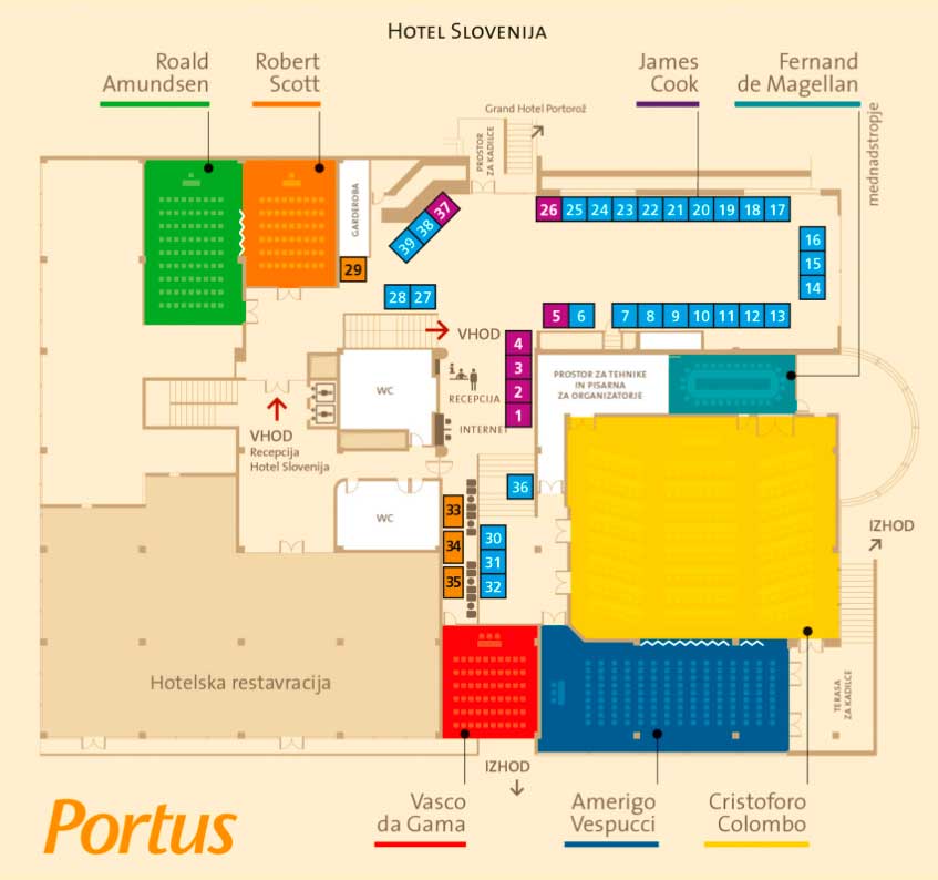 Na spodnji fotografiji si lahko ogledate tloris kongresnega centra z razstavnim prostorom in dvoranami. Predavanja bodo potekala v dvoranah Cristoforo Colombo, Amerigo Vespucci in Amundsen/Scott.
